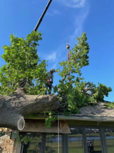 By 4 p.m., our certified arborist team was on site with a crane, skid steer, and full support crew to safely dismantle the tree piece by piece. Because of the tree’s size and the delicate nature of the situation, we worked methodically to lift sections off the home without causing additional damage.
